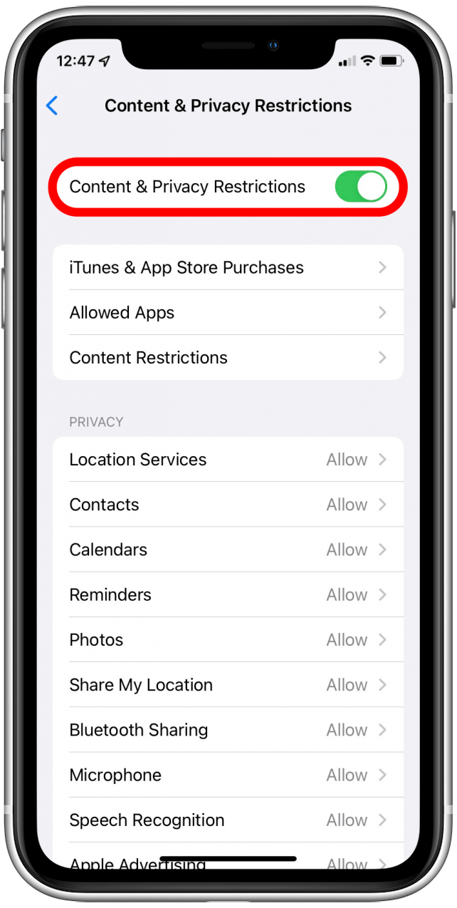 - A toggle change will be shown beside Content material & Privacy Limitations. If the swap is environmentally friendly, you can transform it off by tapping on the toggle.